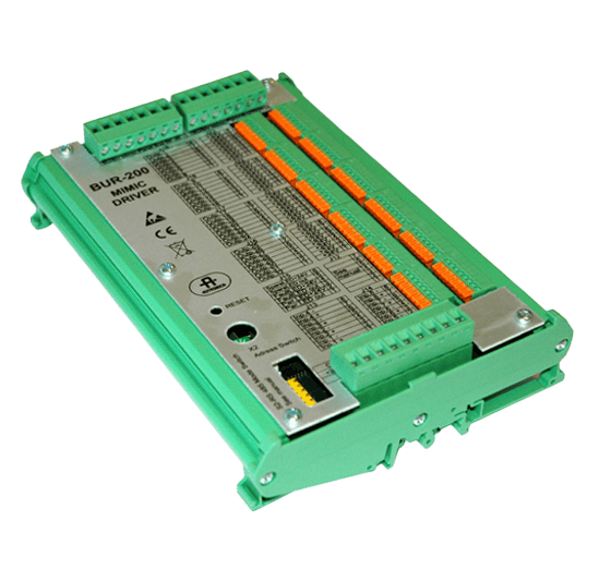 O BUR-200 é um driver simulado capaz de acionar 32 LEDs com resistores em série em um painel simulado para indicação adicional de alarmes. Além disso, 8 entradas monitoradas padrão podem ser usadas para leitura de diversos interruptores.